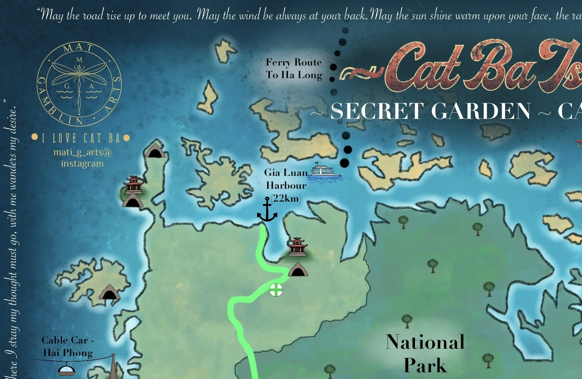 A terrific challenge! The Secret Garden Hostel on Cat Ba Island commissioned this map of the island, featuring their location as the ‘starting point’ and all other points of interest, facilities etc. As requested, a ‘special map with artistic flair’ was just what I delivered.