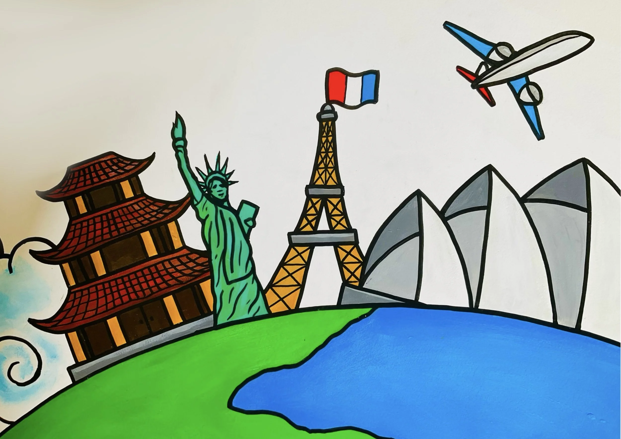 A cute little mural for a cute little school... Simple but colourful , painted at an English School in Ha Long City - Vietnam, featuring some famous global landmarks and cultural treasures. This basic, playful, cartoon style is popular in classrooms where younger students go to learn subjects such as English amongst many others.