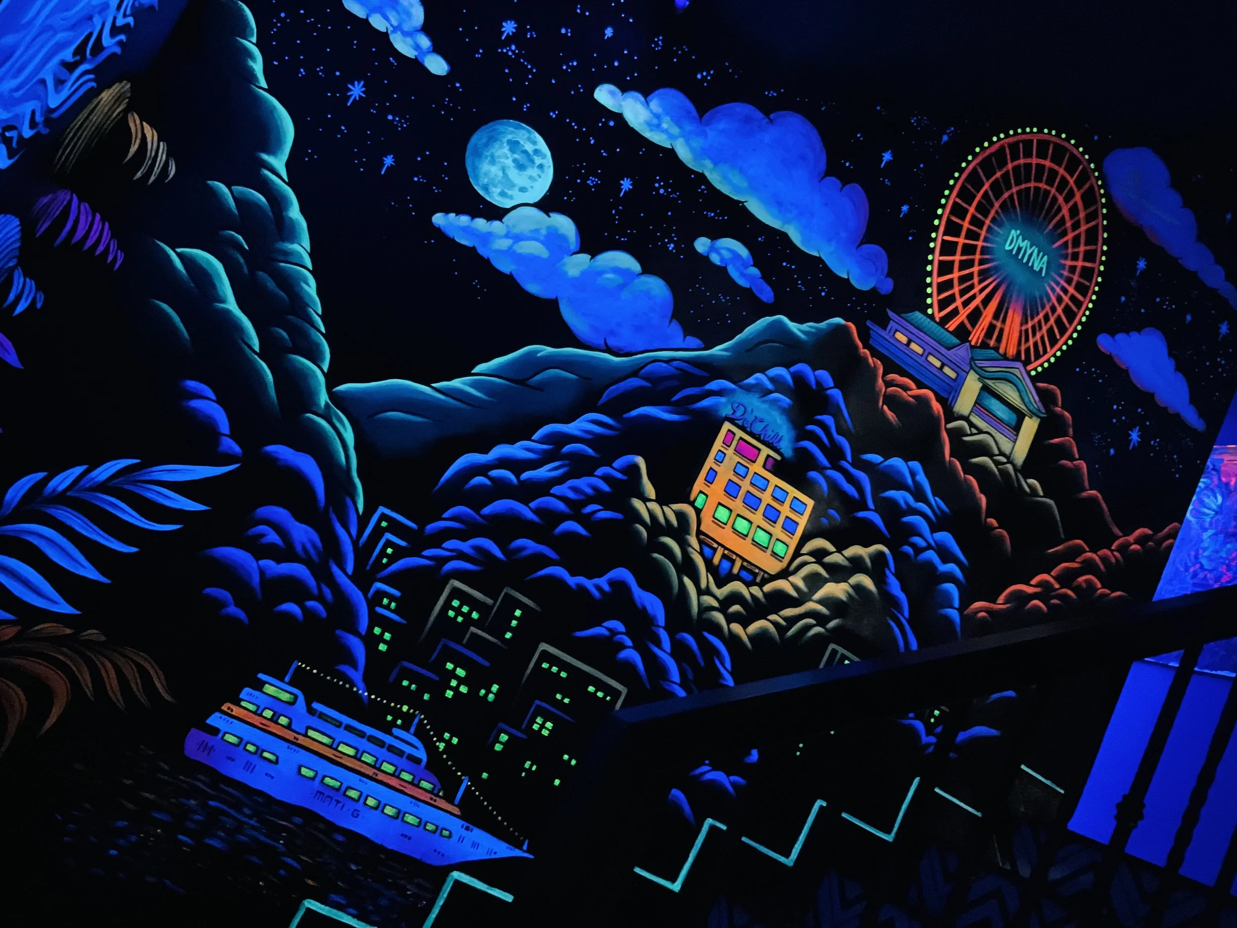I have dabbled in Ultraviolet Art in the past, mainly abstract sculptural installations. However, this was my first Ultraviolet mural, painted on the staircase walls winding up to the top floor of D’myna Sky Bar in Ha Long City, Vietnam. A fairly large painting covering two walls, it was initially a collaboration between myself and a friend from Kazakhstan. Unfortunately, she had to leave unexpectedly shortly after beginning the project, so I was left to complete it.