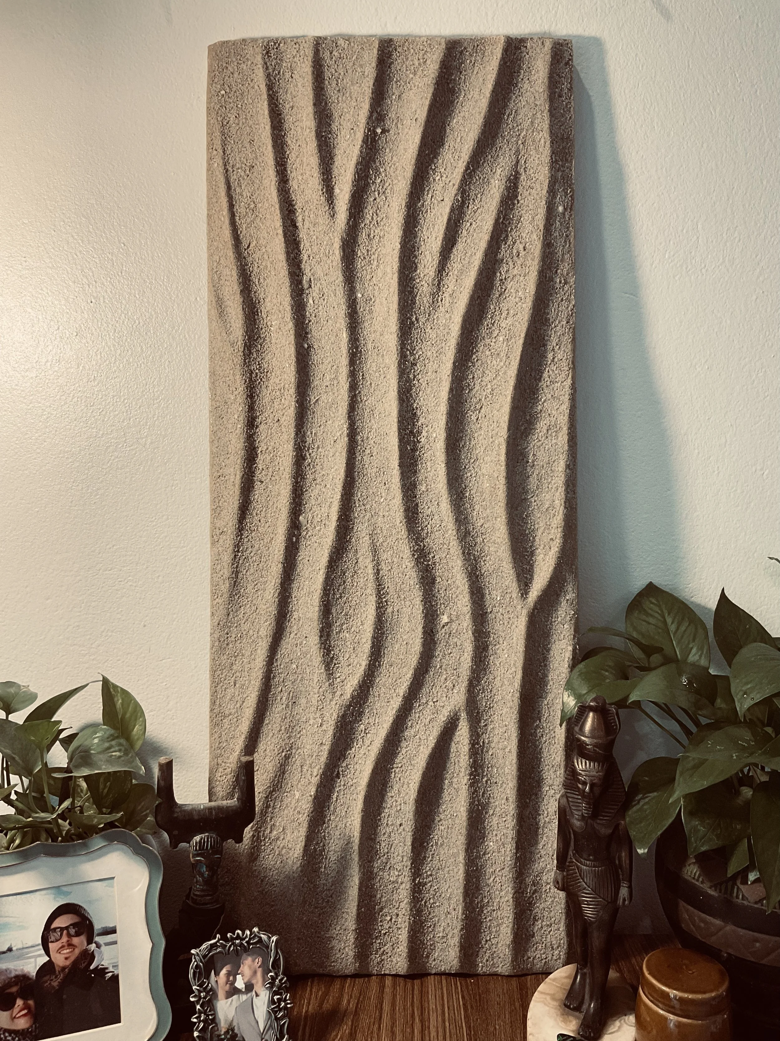 Plywood board, terracotta clay, wall filler, glue, sand and acrylic paint ~ 30x75cm
